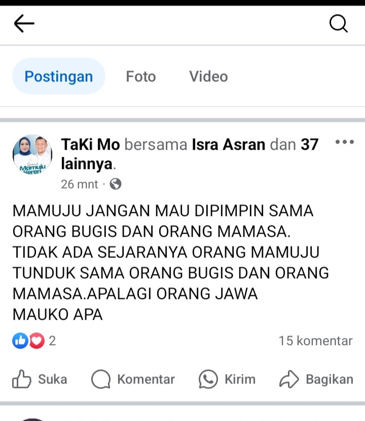 Sementara pernyataan resmi Tim Taki Mamuju Keren 1 Kali Lagi menegaskan bahwa unggahan provokatif ini bukan berasal dari akun resmi pasangan DR. Hj. Sutina Suhardi dan Yuki Permana (TAKI). Unggahan ini adalah fitnah yang bertujuan untuk merusak nama baik kami dan memecah belah masyarakat Mamuju.