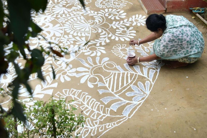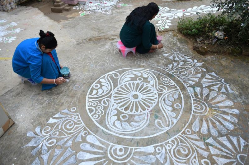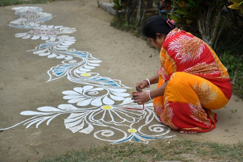 Agartala (ANTARA) – Masyarakat di Agartala, ibu kota Negara Bagian Tripura, India timur laut, melakukan tradisi artistik pembuatan rangoli, dekorasi lantai yang rumit, di luar rumah mereka pada malam perayaan festival Hindu Makar Sankranti.