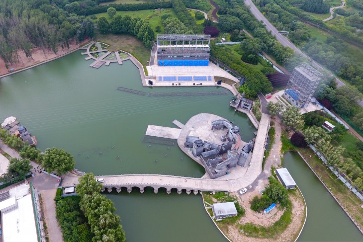 Foto dari udara yang menunjukkan sebuah panggung pertunjukan terbuka di situs bersejarah Dijicheng di Wilayah Yangcheng, Provinsi Shanxi, China utara, Rabu (7/7/2020), dibangun dan dikembangkan pada era Dinasti Ming (1368-1644) dan era Dinasti Qing (1644-1911), kota kuno Guoyu dan situs bersejarah Dijicheng adalah kompleks benteng kuno yang khas di China utara. ANTARA FOTO/Xinhua-Chai Ting/hp.