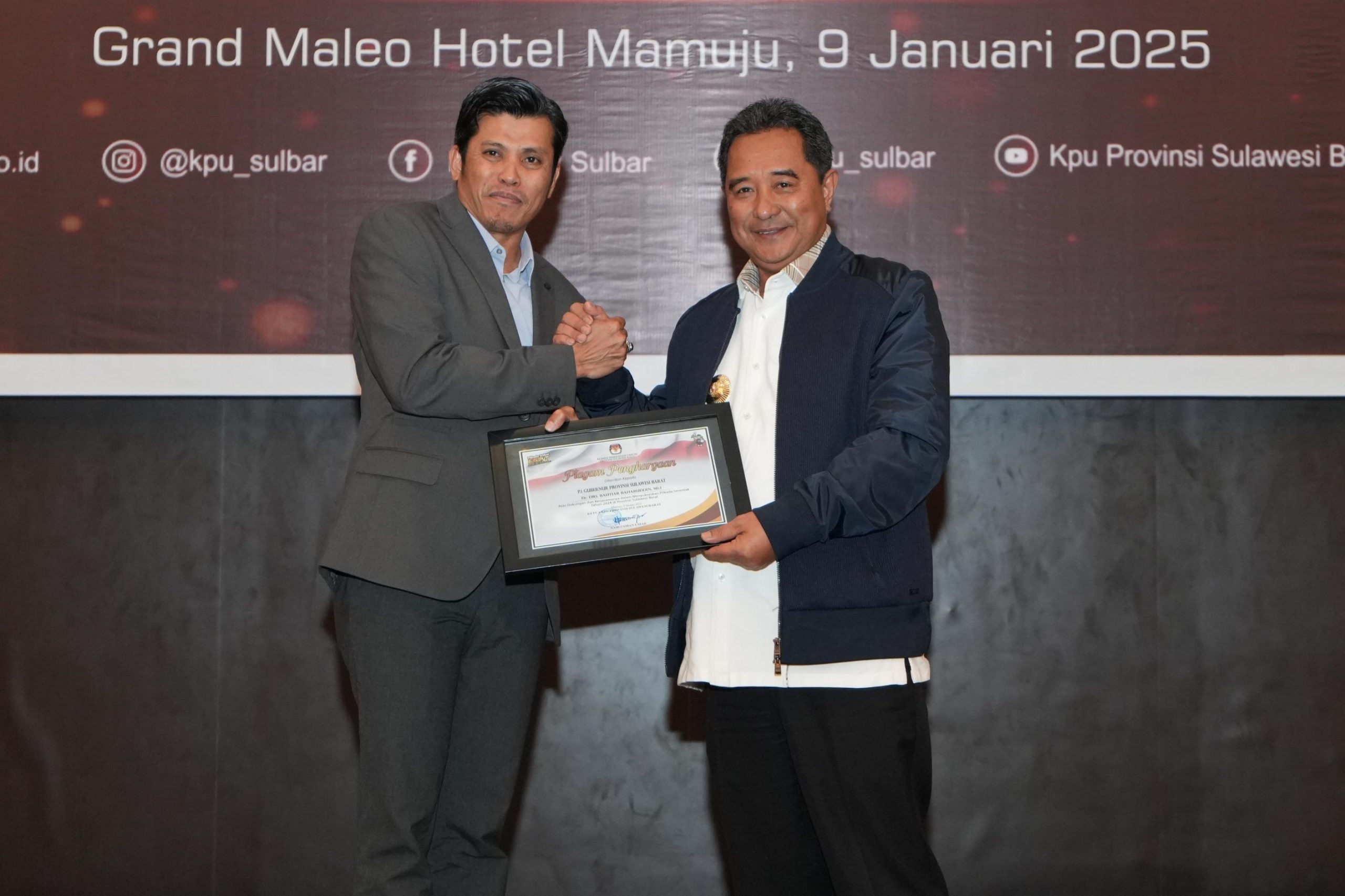 Piagam penghargaan tersebut diberikan pada rapat pleno terbuka penetapan Gubernur dan Wakil Gubernur Sulbar terpilih, berkat dedikasi dan dukungan yang diberikan dalam menyukseskan Pilkada 2024 di Sulbar.