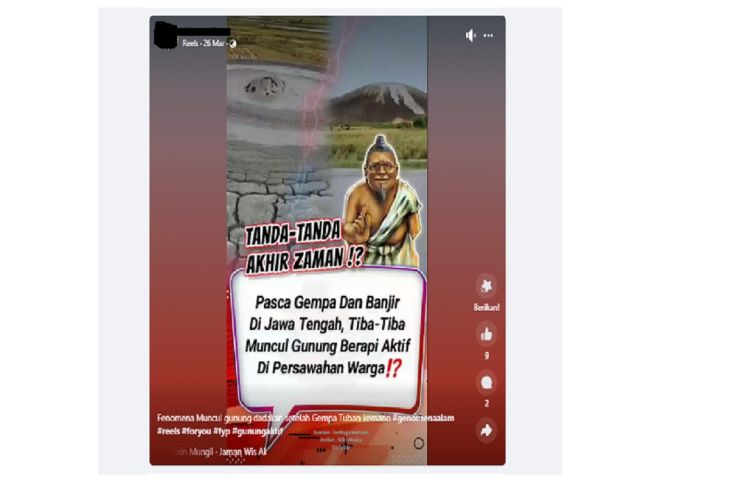 Tangkapan layar narasi hoaks yang menyatakan gunung yang muncul pascagempa Tuban dan banjir Demak jadi tanda akhir zaman (Facebook)