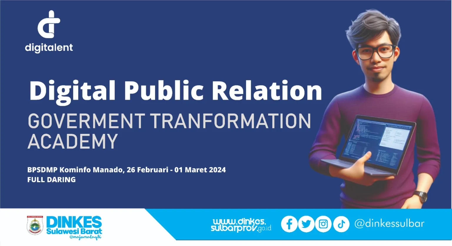 MAMUJU – Tenaga Kehumasan Dinas Kesehatan (Dinkes) Sulawesi Barat (Sulbar) mengikuti Pelatihan Digital Public Relation Government Transformation Academy (GTA) yang diselenggarakan oleh Badan Pengembangan Sumber Daya Manusia Perhubungan (BPSDMP) Manado. Pelatihan ini dilaksanakan secara daring (online) mulai 26 Februari hingga 1 Maret 2024.