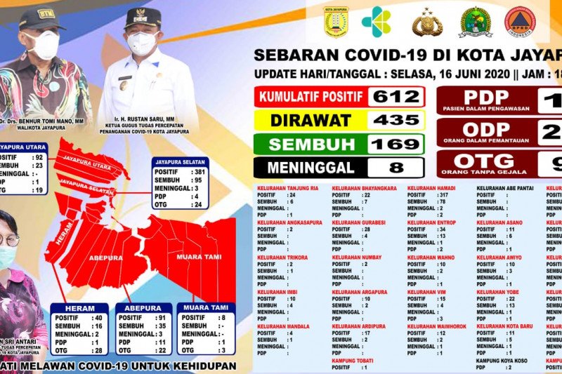 Kemudian, Kelurahan Asano enam orang yang sembuh, Kelurahan Awiyo tiga orang, Kelurahan Yobe sebanyak 13 orang yang sembuh, Kelurahan Kota Baru lima orang, Kelurahan Hedam dua orang, Kelurahan Waena enam orang, dan Kelurahan Yabansai delapan orang.