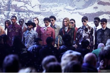Model menampilkan koleksi busana pria Fall-Winter 2024/2025 dari desainer Pharrell Williams dalam ajang Men’s Fashion Week di Paris, Prancis, Selasa (16/1/2024). ANTARA FOTO/REUTERS/Stephanie Lecocq/foc.