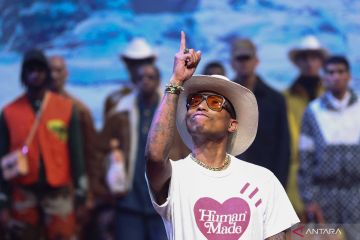 Desainer yang juga musisi Pharrell Williams tampil saat peragaan busana kreasinya untuk Louis Vuitton dalam ajang Men’s Fashion Week di Paris, Prancis, Selasa (16/1/2024). ANTARA FOTO/REUTERS/Stephanie Lecocq/foc.