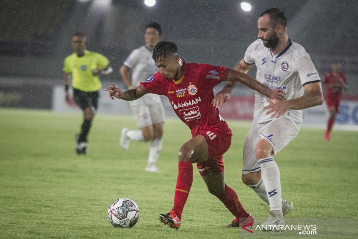 Pesepakbola Persija Jakarta Alfriyanto Nico Saputra (kiri) berusaha melewati hadangan pesepakbola Arema FC Sergio Domingos Reis Silva (kanan) pada pertandingan Liga I di Stadion Manahan, Solo, Jawa Tengah, Minggu (17/10/2021). Pada pertandingan tersebut Arema FC menang atas Persija Jakarta dengan skor 1-0. ANTARA FOTO/Mohammad Ayudha/aww.