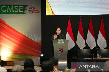 Menteri BUMN Erick Thohir menyampaikan pidato dalam acara Inspirational Talk: “Berinvestasi untuk Berprestasi” yang merupakan bagian dari Capital Market Summit & Expo 2023 di BEI, Jakarta, Sabtu (28/10/2023). Acara tersebut hasil kerja sama Yayasan Bakti Sepak Bola Indonesia dan Bursa Efek Indonesia dan turut dihadiri oleh atlet mantan timnas sepak bola, Irfan Bachdim dan Ismed Sofyan. ANTARA FOTO/HO/foc.