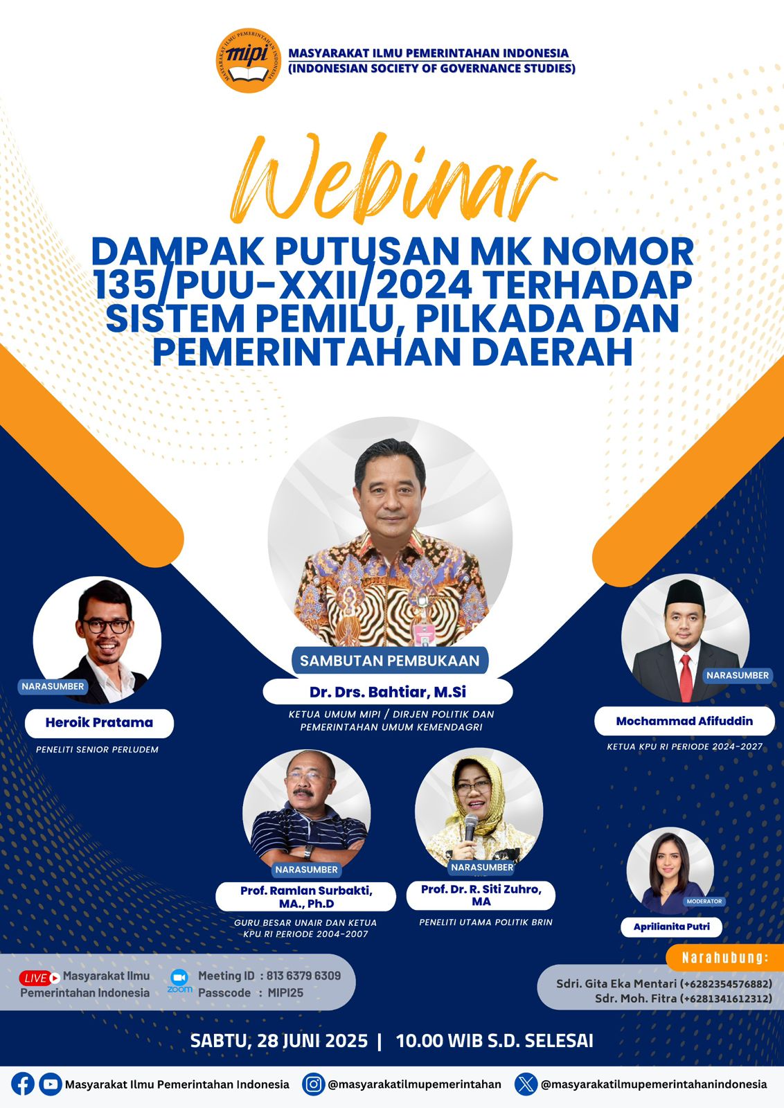 JAKARTA – Pengurus Pusat Masyarakat Ilmu Pemerintahan Indonesia (MIPI) kembali akan menggelar diskusi dalam bentuk webinar. Kali ini, tema yang diangkat adalah dampak putusan MK Nomor 135/PUU-XXII/2024 terhadap sistem Pemilu, Pilkada dan Pemerintahan Daerah.