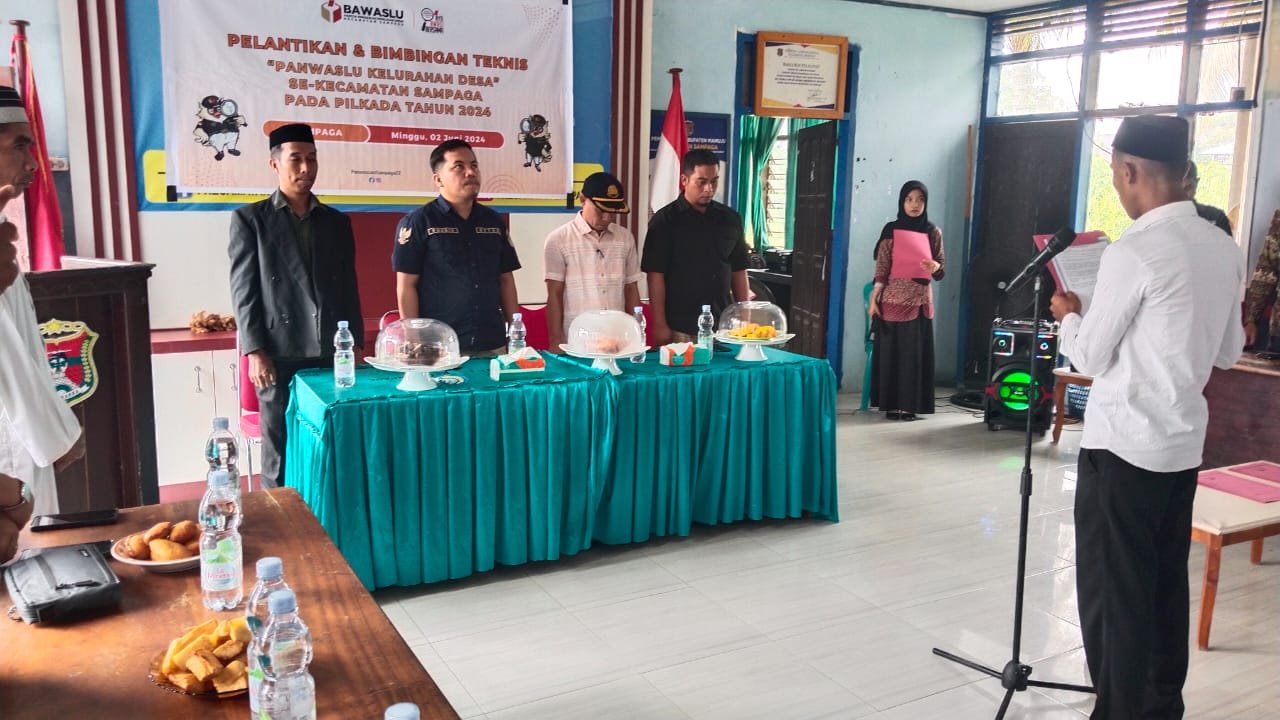 MAMUJU – Suasana Hikmat menyelimuti Aula Kantor Kecamatan Sampaga pada saat pembacaan fakta intekritas pelaksanaan pelantikan Pengawas Pemilihan Kelurahan/Desa (PKD) Pilkada Serentak Tahun 2024 di Aula Kantor Camat. Minggu, 2 Juni 2024.