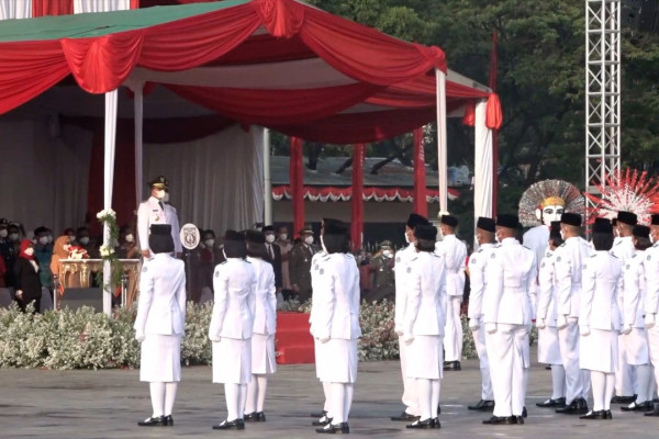 ANTARA – Aparatur Sipil Negara di lingkungan Pemerintah Provinsi DKI Jakarta, Rabu (17/8), menggelar upacara Hari Ulang Tahun ke-77 Kemerdekaan Republik Indonesia di Plaza Selatan Monas, Jakarta. Gubernur DKI Jakarta Anies Baswedan yang menjadi inspektur upacara menyampaikan agar upacara bendera tidak dimaknai sekadar seremonial tahunan, namun juga pengingat bahwa para pejuang telah memperjuangkan bendera merah putih berkibar di Indonesia dengan pengorbanan besar. (Azhfar Robbani/Denno Asmara/Nusantara Mulkan)