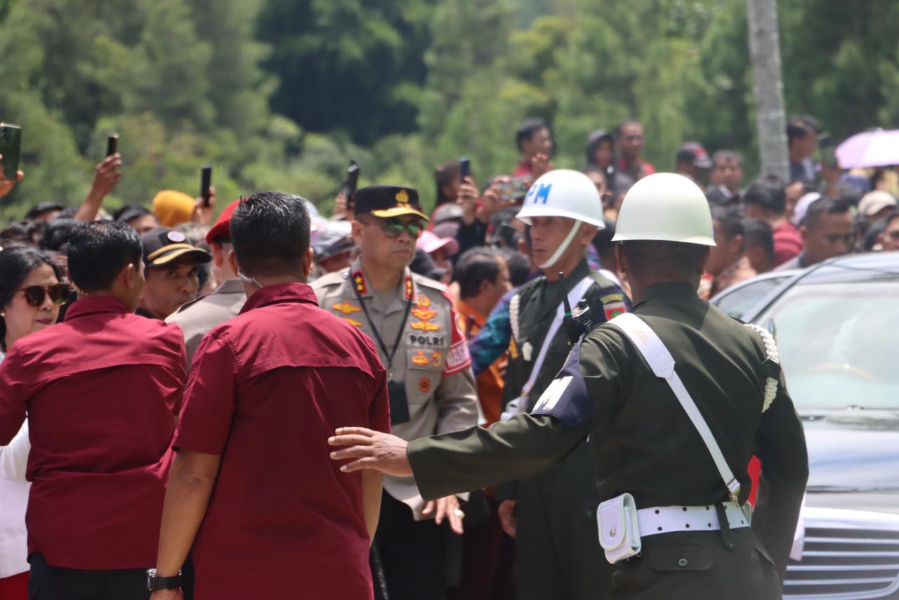 Para personel yang melakukan pengamanan terlihat sibuk menghimbau serta menghalau masyarakat yang sangat antusias ingin bertemu langsung Presiden.