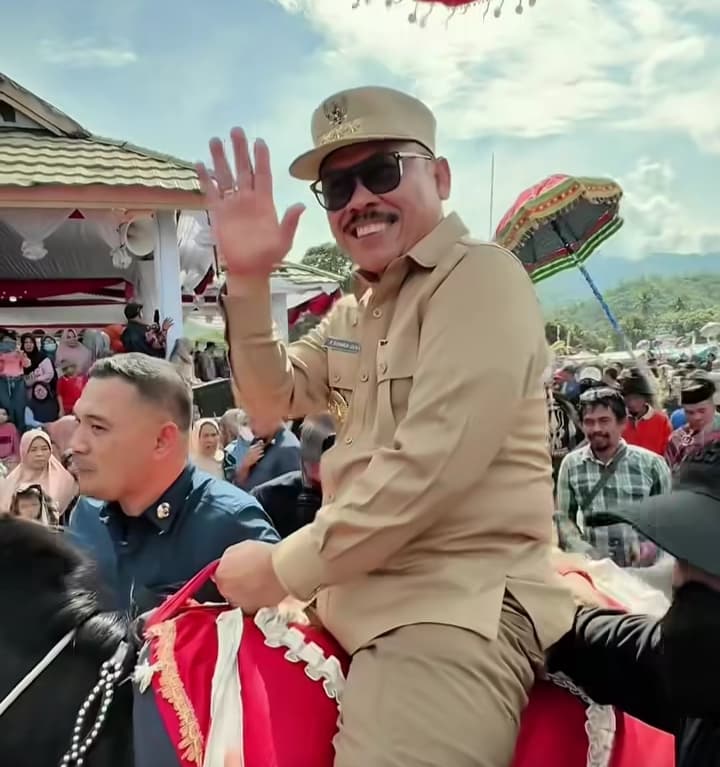 MAJENE – Gubernur Sulawesi Barat Suhardi Duka ikut naik Sayyang Pattudu (Kuda menari) di Kabupaten Majene saat hadiri tamatan massal untuk anak-anak Sekolah Dasar (SD) dan Madrasah Ibtidaiyah (MI), Selasa 24 Juni 2025.